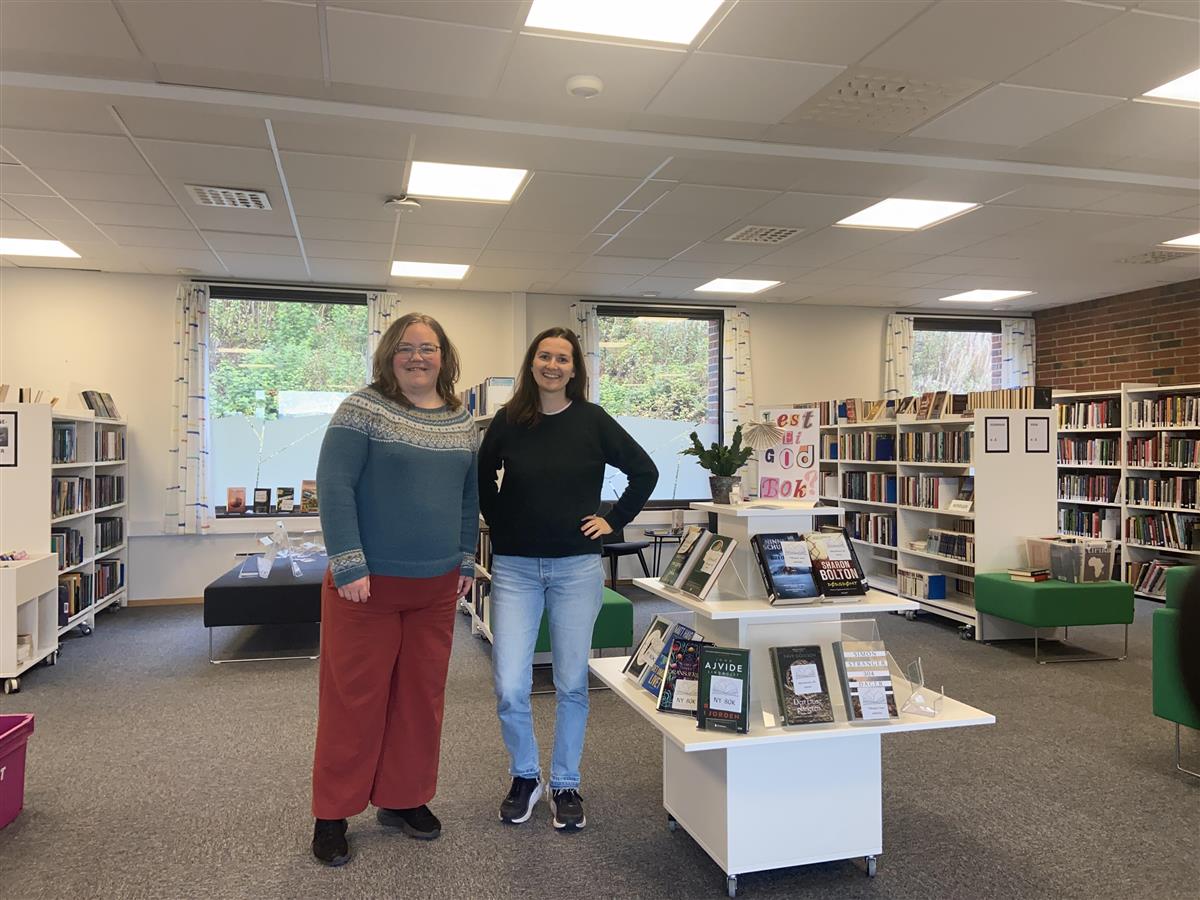 biblioteksjef og dagleg leiar i Askvoll frivilligsentral står saman på biblioteket - Klikk for stort bileteJune Audsdotter Stafsnes og Vlada Tsytsyurska Privat