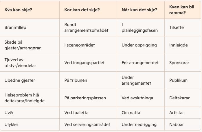 Her kan du lage ein tryggleiksplan med risiko- og sårbarheitsanalyse for eit arrangement